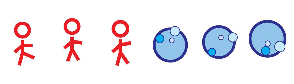 Several children are lined up as a team facing the fearsome bubble monsters. The children aim to make their way safely through all the bubble monsters to the right, while the monsters aim to block them.
