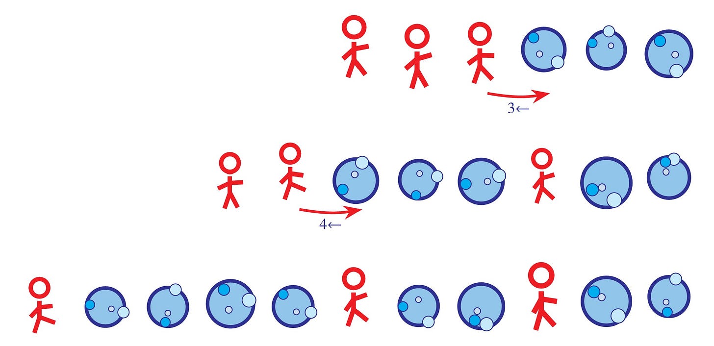 The first child successfully passed through the leading monster, which duplicated into three, for a total of five monsters. Then the next child poked through her monster, which regenerated as four, for a total of eight monsters. Oh dear, the monster problem is getting worse! The children face a difficult realization of their precarious position—the only way for them to reach safety, after all, is to push through the monsters, but whenever they do so, additional monsters are created in the wake, which must still be surmounted.