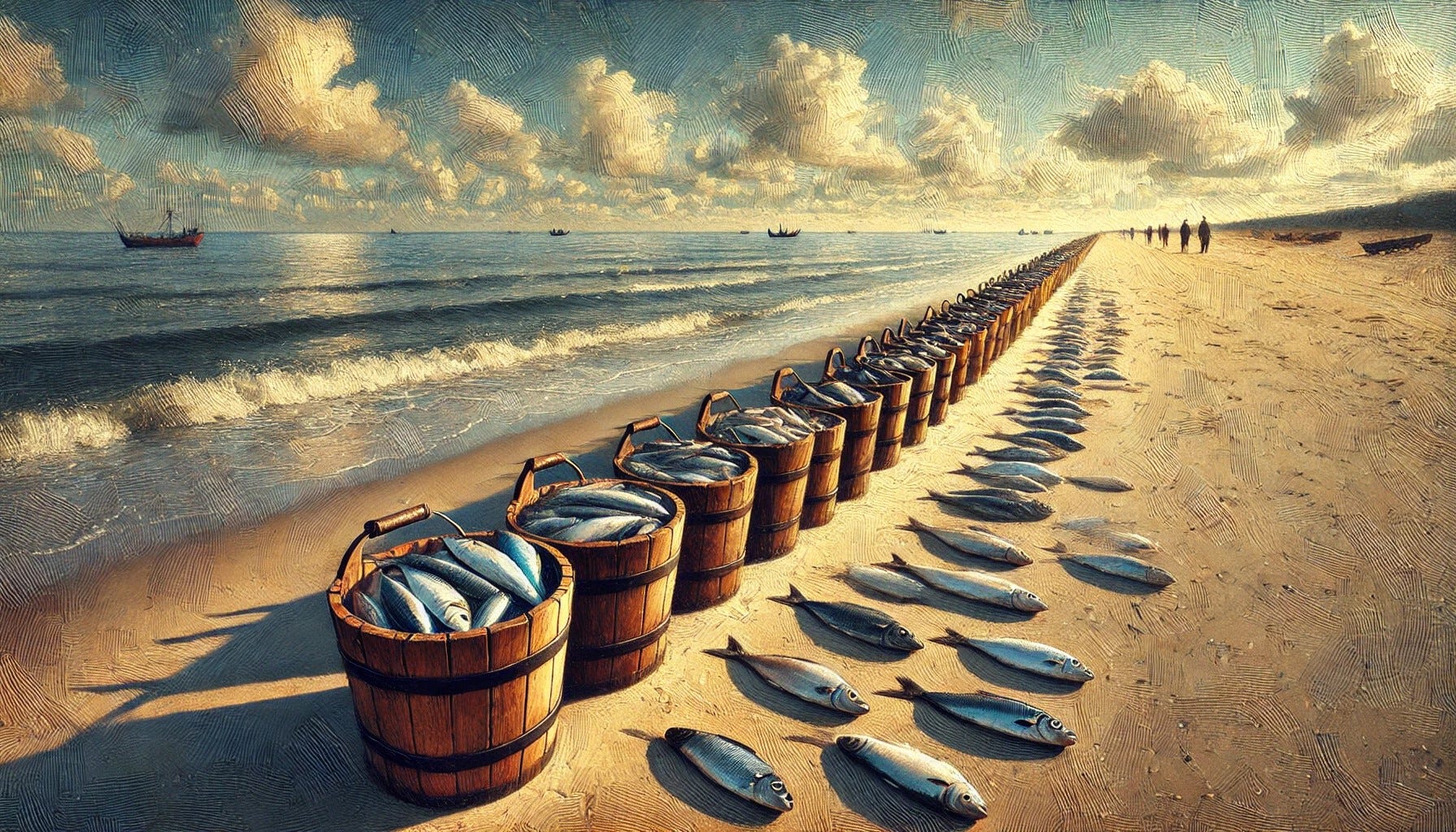 The game I call Buckets of Fish is played, even if mainly in the imagination, on the beach with finitely many buckets in a line—some of the buckets hold some freshly caught fish, and there is an endless supply of more fish fresh off the boats. Players take turns, and on each turn one fish is removed from one bucket and then as many new fish as desired (or none) are added to buckets to the left.