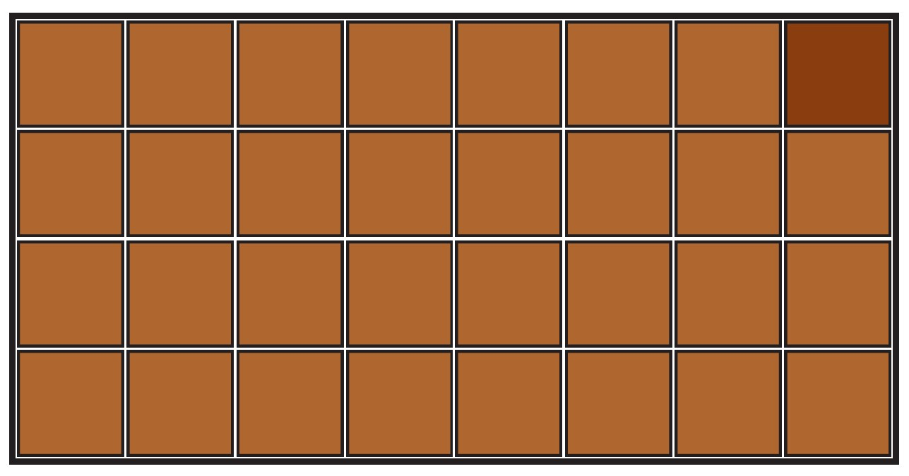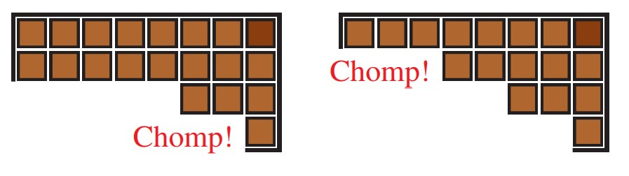 According to the rules of the game, the players will “chomp” the bar always from the lower left, selecting on each move a particular square in the bar and removing it along with the rest of the bar below and to the left of that square. The player who chomps the very last highlighted square at the upper right loses.