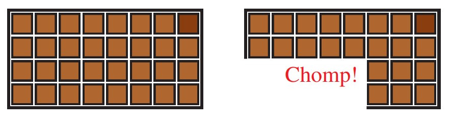 Consider next the game of Chomp, in which two players have turns taking bites from a delicious bar of chocolate. We consider an n × m rectangular chocolate bar, consisting of small chocolate squares.