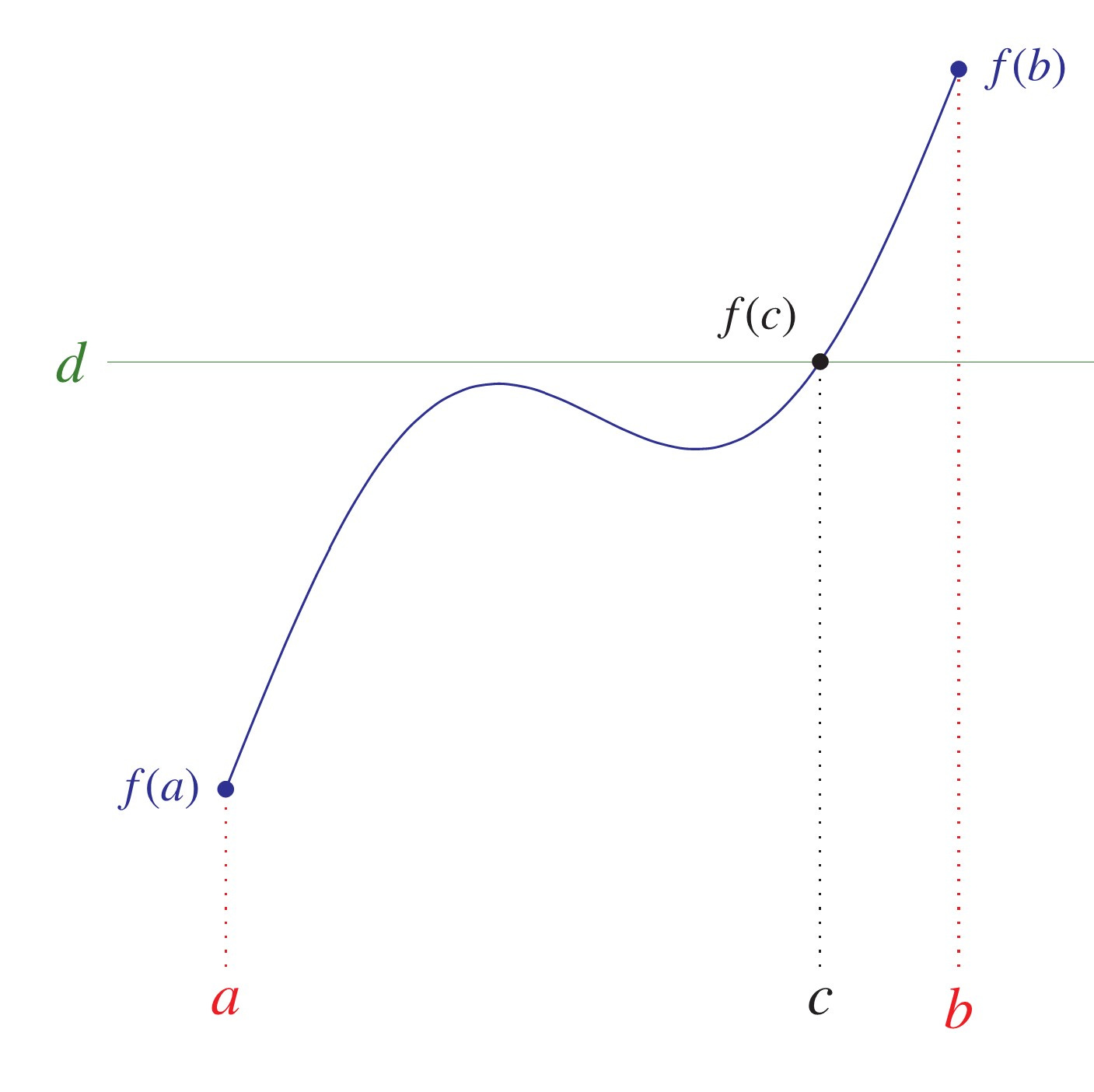 Let us illustrate how this fundamental principle is used by sketching proofs of a few familiar elementary results in real analysis. Consider first the intermediate-value theorem, which asserts that if f is a continuous function on the real numbers and d is an intermediate value between f(a) and f(b), then there is a real number c between a and b, with f(c) = d. In short, it asserts that for continuous functions, every intermediate value is realized.