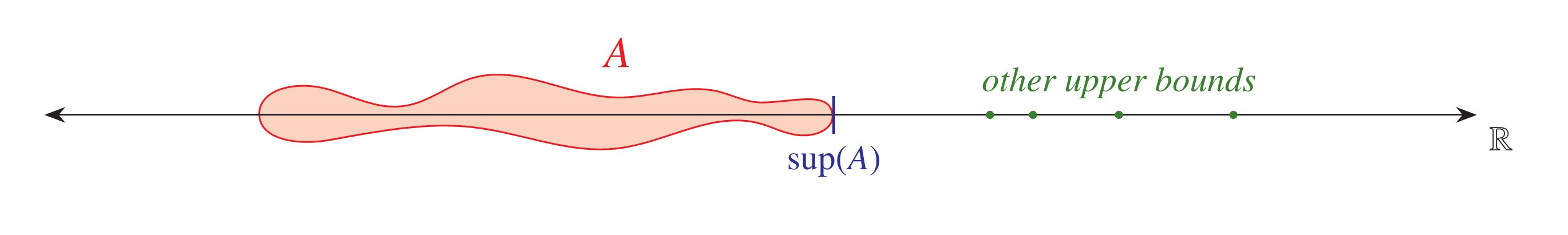 An upper bound of a set A ⊆ ℝ is simply a real number r, such that every element of A is less than or equal to r. The number r is the least upper bound of A, also called the supremum of A and denoted sup(A), if r is an upper bound of A and r ⩽ s whenever s is an upper bound of A.